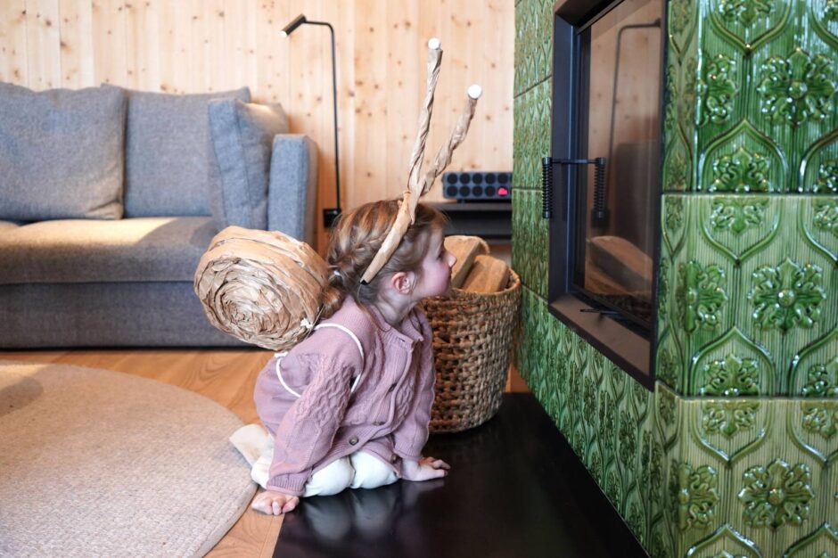 - Jetzt fehlen noch die Träger, damit das Schneckenhaus wie ein Rucksack getragen werden kann. Dafür einfach 4 Löcher in die Ecken der Pappe machen und dicke Schnüre oder Bänder daran befestigen. (vorher unbedingt ausmessen, wie lang die „Träger“ sein sollen.)