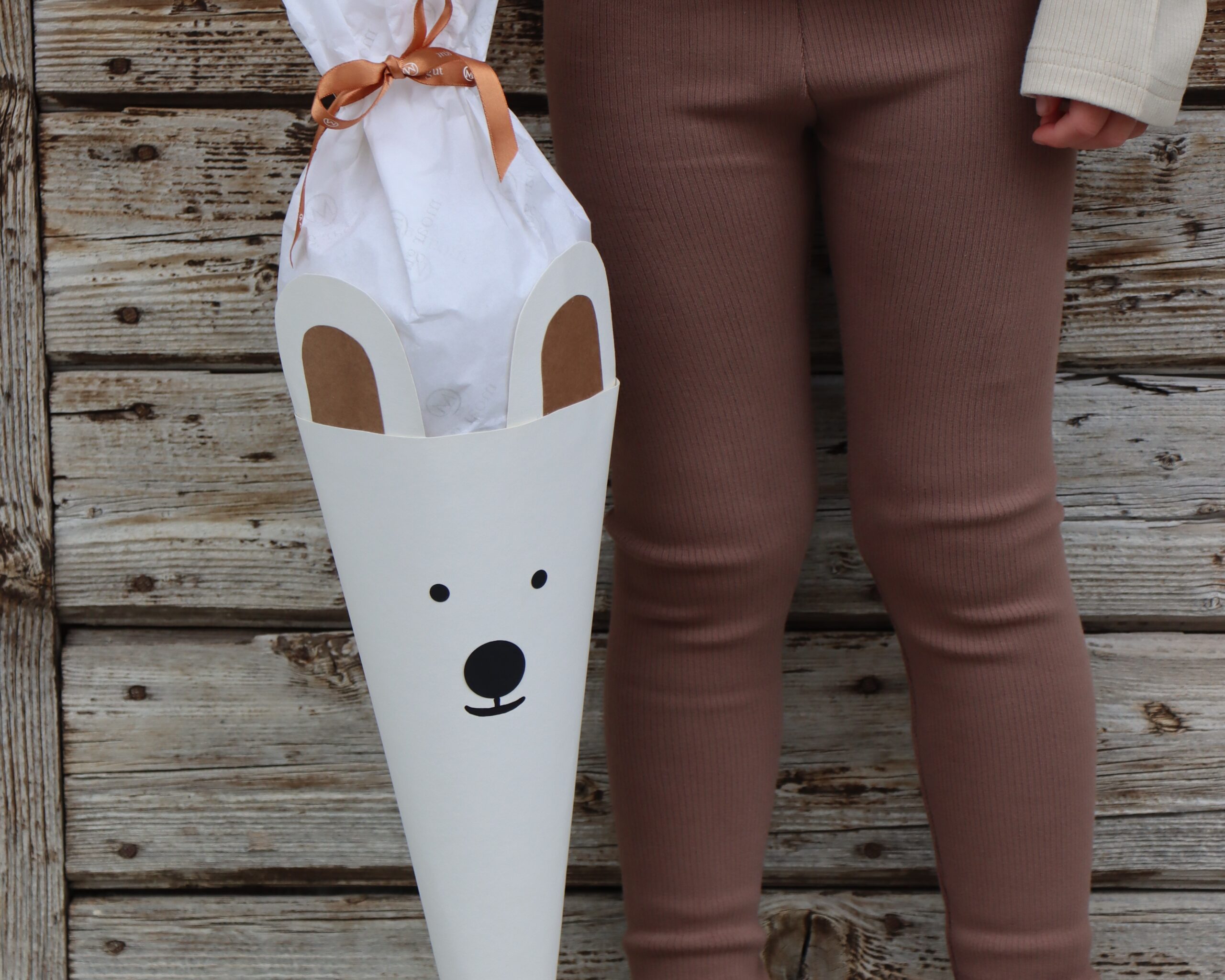 - Zum Schluss kommt noch das Krepp- oder Organza-Papier an die Schultüte. Dieses mit Klebstoff am oberen, inneren Rand befestigen und mit einer Schleife verschließen.