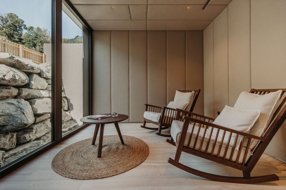 Im edlen Natur Spa sind viele gemütliche Ecken zu finden. Vor allem der Ruheraum „Steinblick“ hat es uns angetan. Klein aber fein und mit zwei Schaukelstühlen bestückt. Leise Musik ist zu hören, der Duft von frischen Kräutern liegt in der Luft und die Zeit bleibt wohl für kurze Zeit stehen.