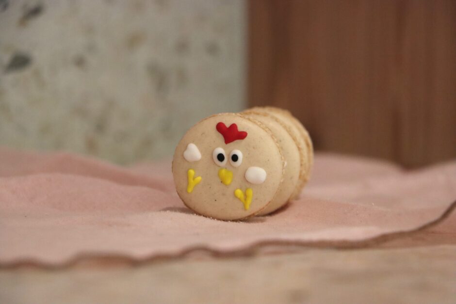 - Am nächsten Tag die fertigen Macarons mit der Eiweißglasur verzieren.
