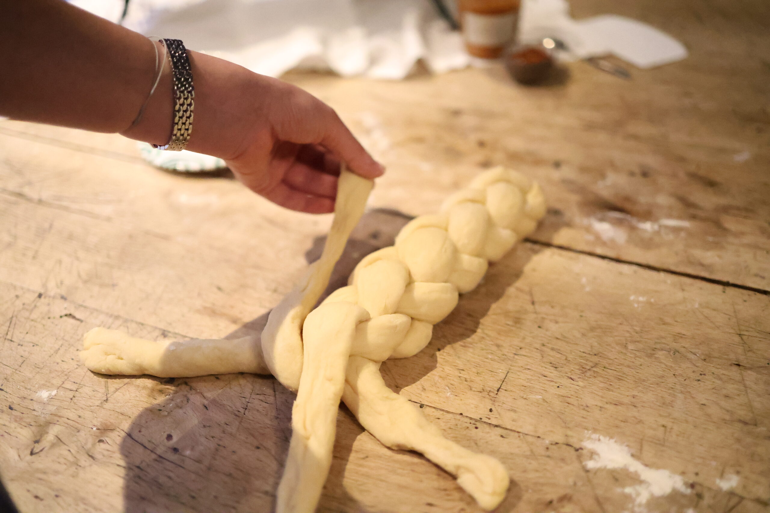 - Nun die Teigsträhnen wie ein Kreuz auflegen und in der Mitte mit den Fingern zusammendrücken.