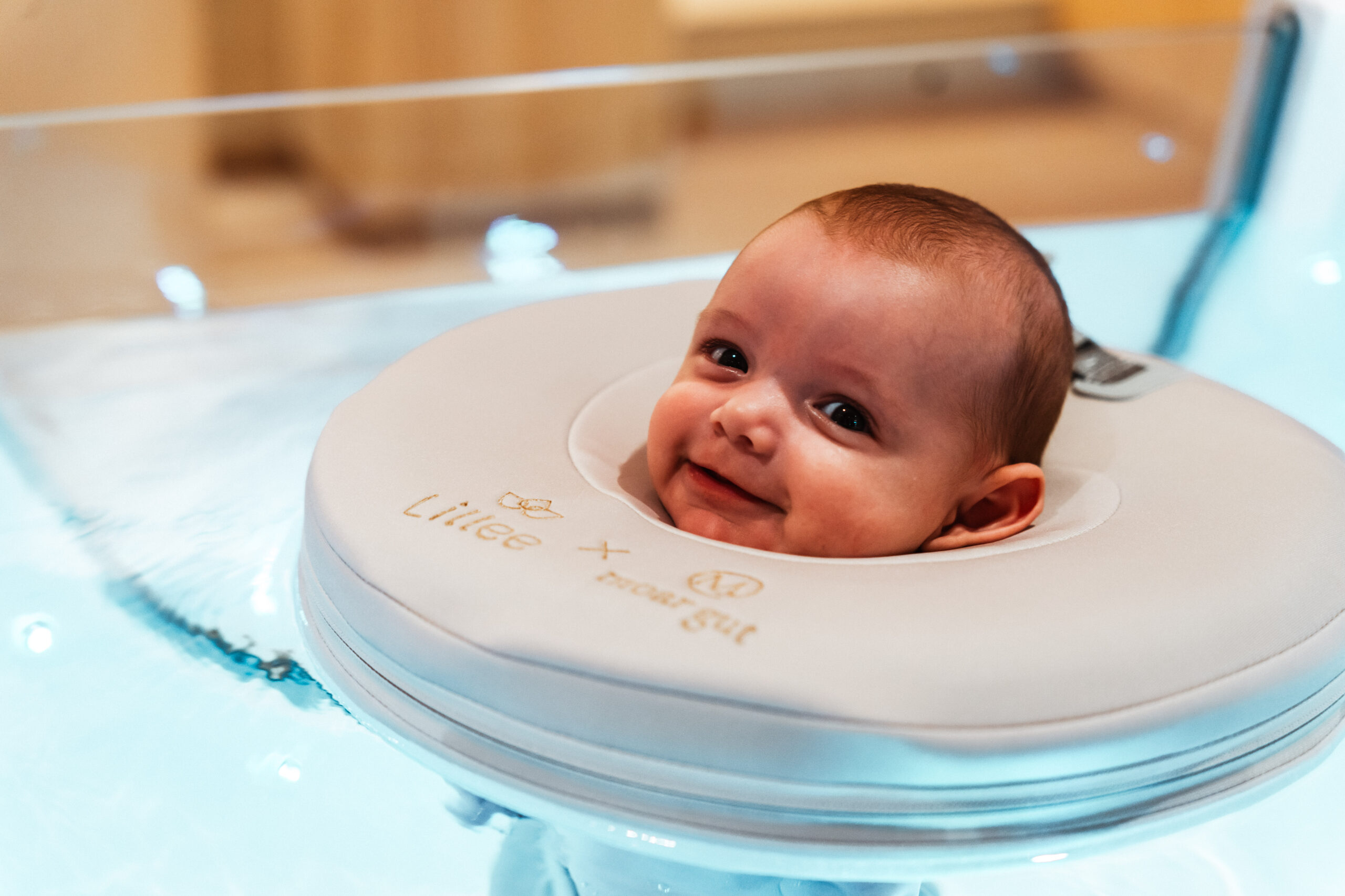 Mit einem speziellen Floatingring ausgestattet, kann sich das Baby in einer speziellen Babybadewanne, gefüllt mit warmen Bergquellwasser, frei bewegen. Ähnlich wie im Mutterleib. Der Floatingring sorgt dafür, dass Arme und Beine frei bleiben und lediglich Kinn und Nacken am Ring aufliegen. Dieses schwerelose Gefühl kann sich besonders entspannend aufs vegetative Nervensystem auswirken: