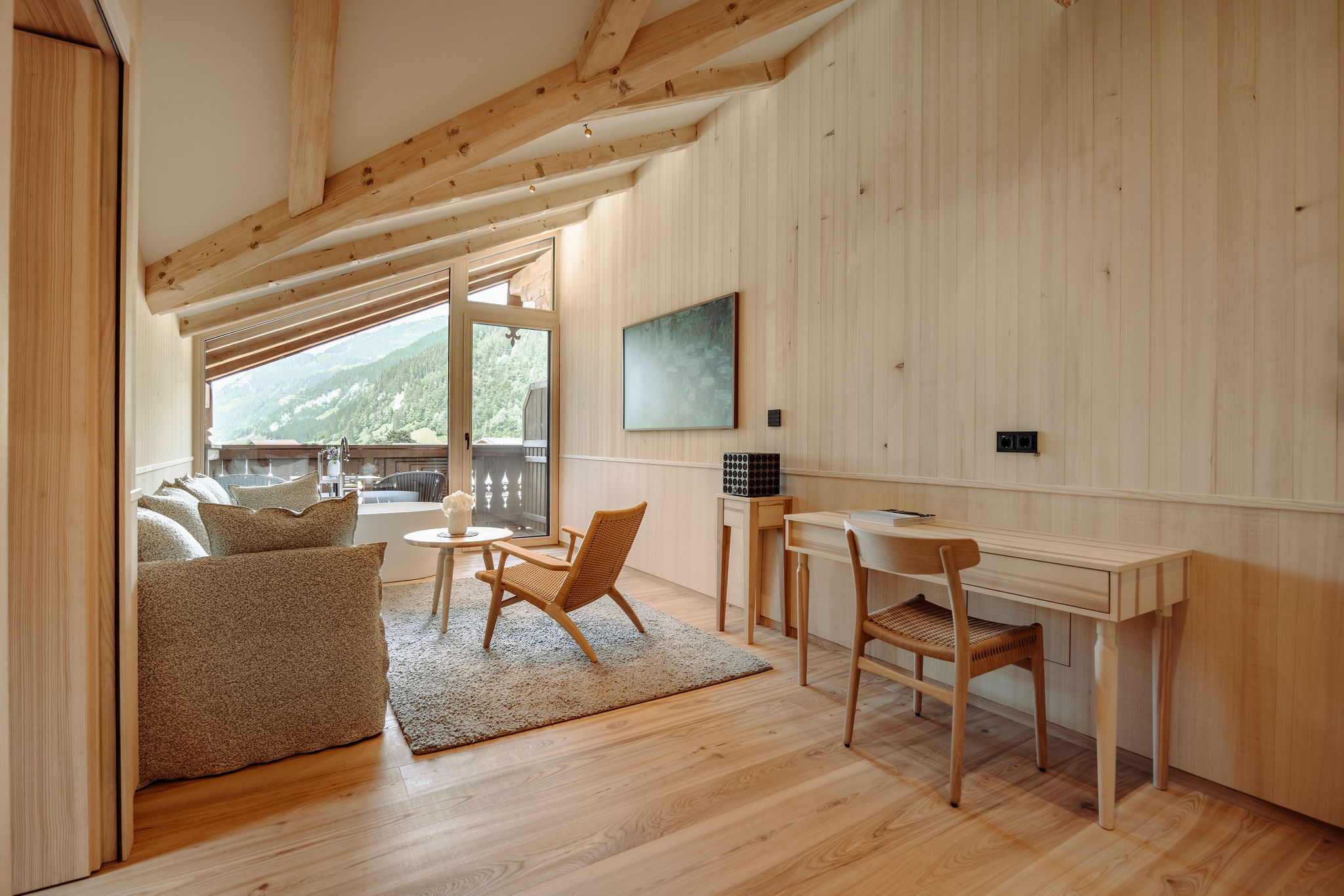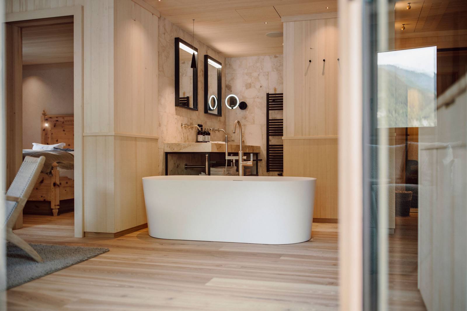 Die Familiensuite Melisse Loft bietet ein besonderes Highlight: eine freistehenden Badewanne im Wohnbereich mit einzigartigen Weitblick in die Salzburger Bergwelt.