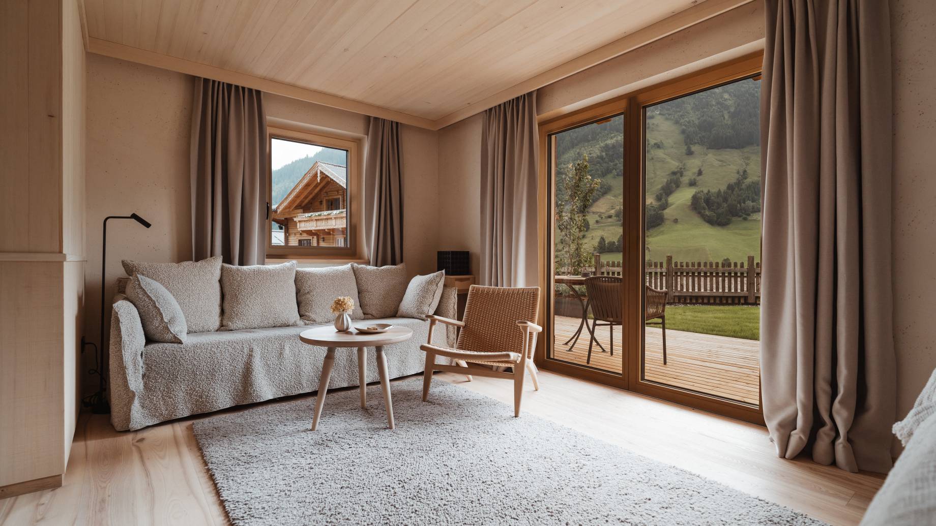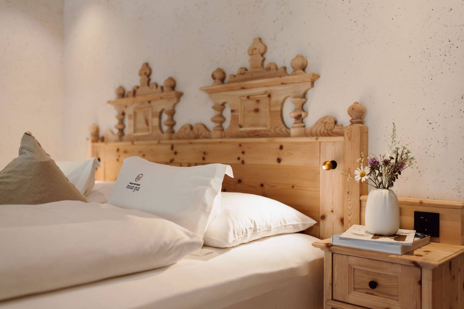 Wie auch bereits im Hochgartl werden bei der Neugestaltung der Suiten im Kräuter- und Blumengartl vorrangig heimische Materialien, wie die Weißtanne, verwendet. Um die Ressourcen zu schonen und auf das Morgen zu achten, haben wir die bestehenden Zirbenbetten in die neuen Suiten integriert.
