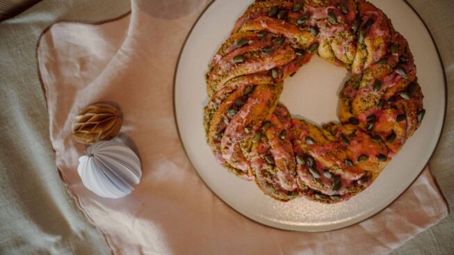 - Den Teig zu einer Kugel formen und in Frischhaltefolie packen und für 30 Minuten im Kühlschrank rasten lassen.