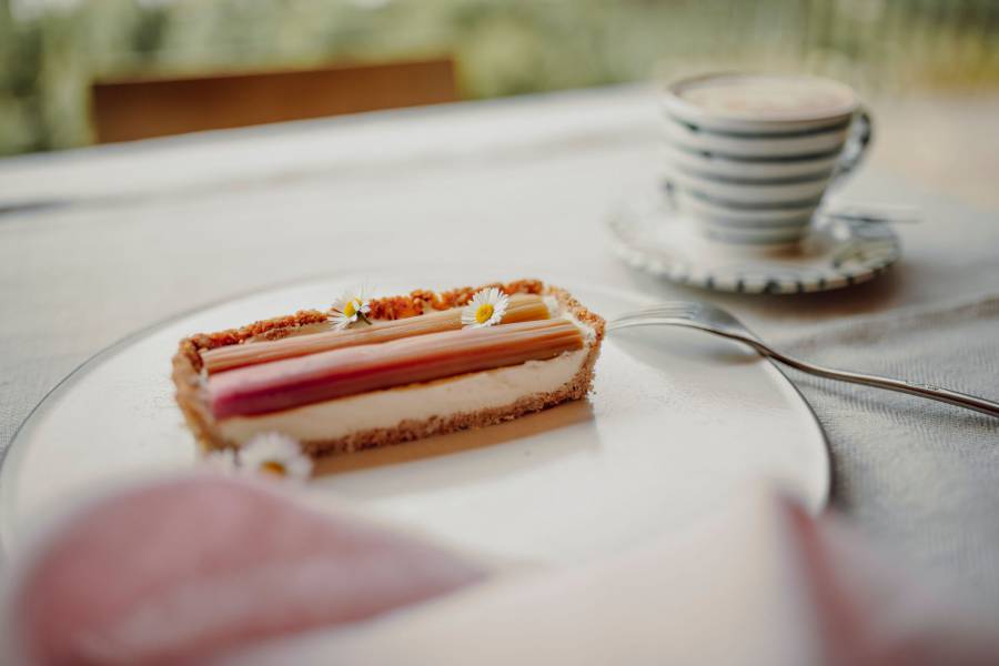 Die Tarte aus dem Kühlschrank nehmen und die Rhabarberstücke darauflegen. Die fertige Tarte für weitere 2-3 Stunden in den Kühlschrank geben.