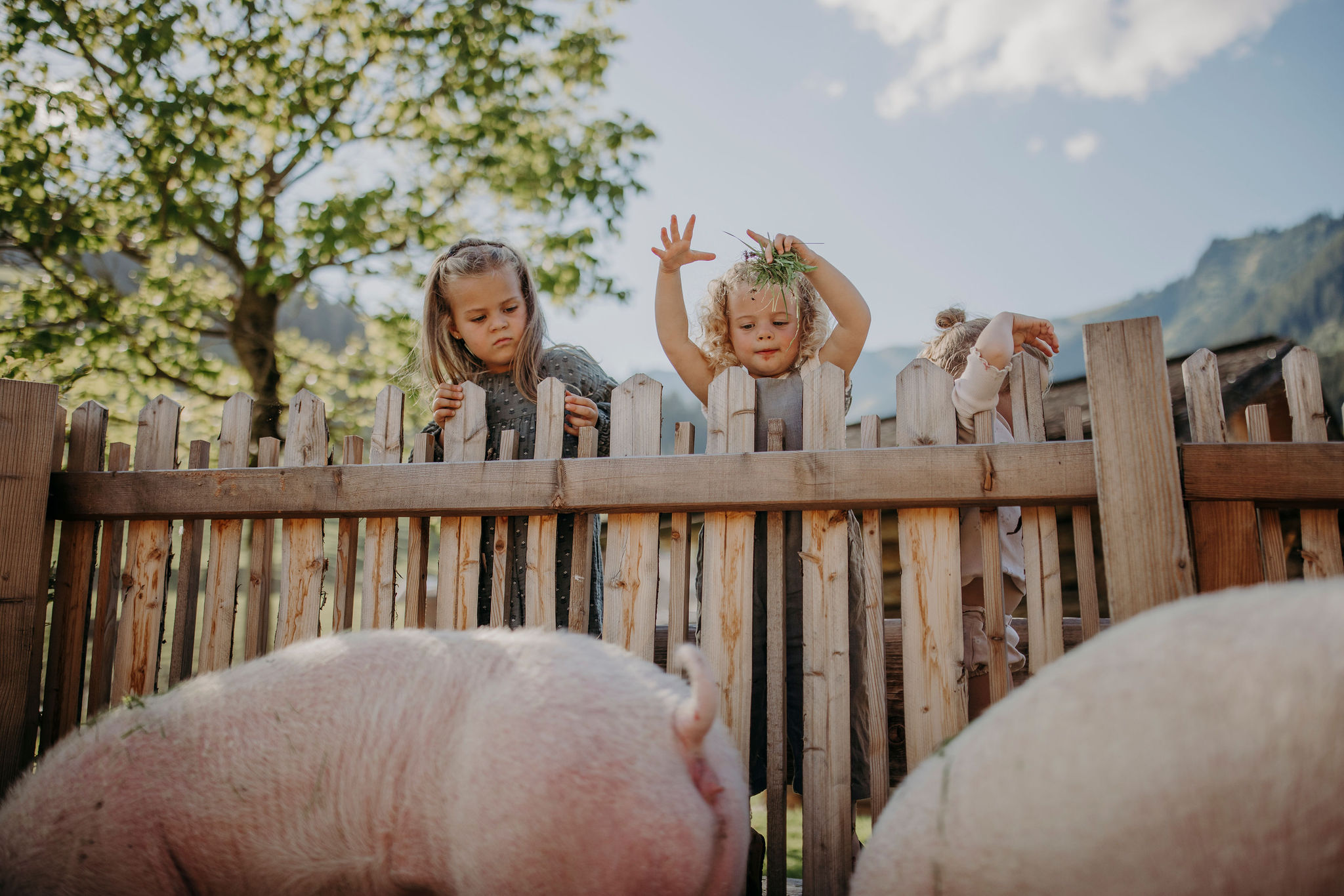 Hier seht ihr mich mit meinem beiden Schwestern Emma und Paula. Zusammen sind wir das Schweinetrio am Moar Gut. Und wir lieben es. Vor allem mögen wir das gemütliche Sonnenbaden und auch das Schlammbad. Wisst ihr, wir müssen uns im Sommer nämlich gut im Schlamm baden. Das hilft nicht nur gegen die Sonne, sondern kühlt und auch ab und säubert uns gleichzeitig. Hach, wie fein das ist!