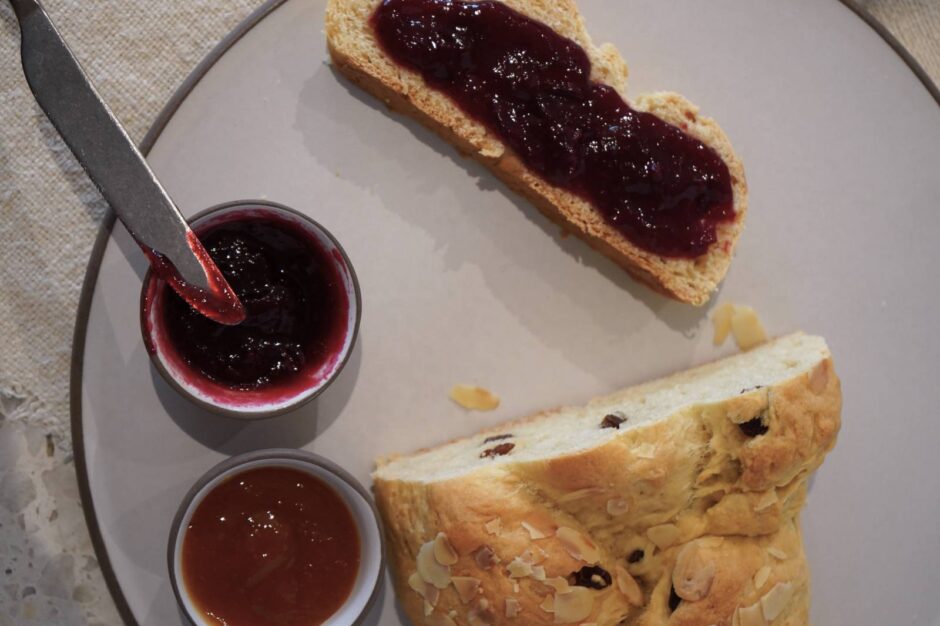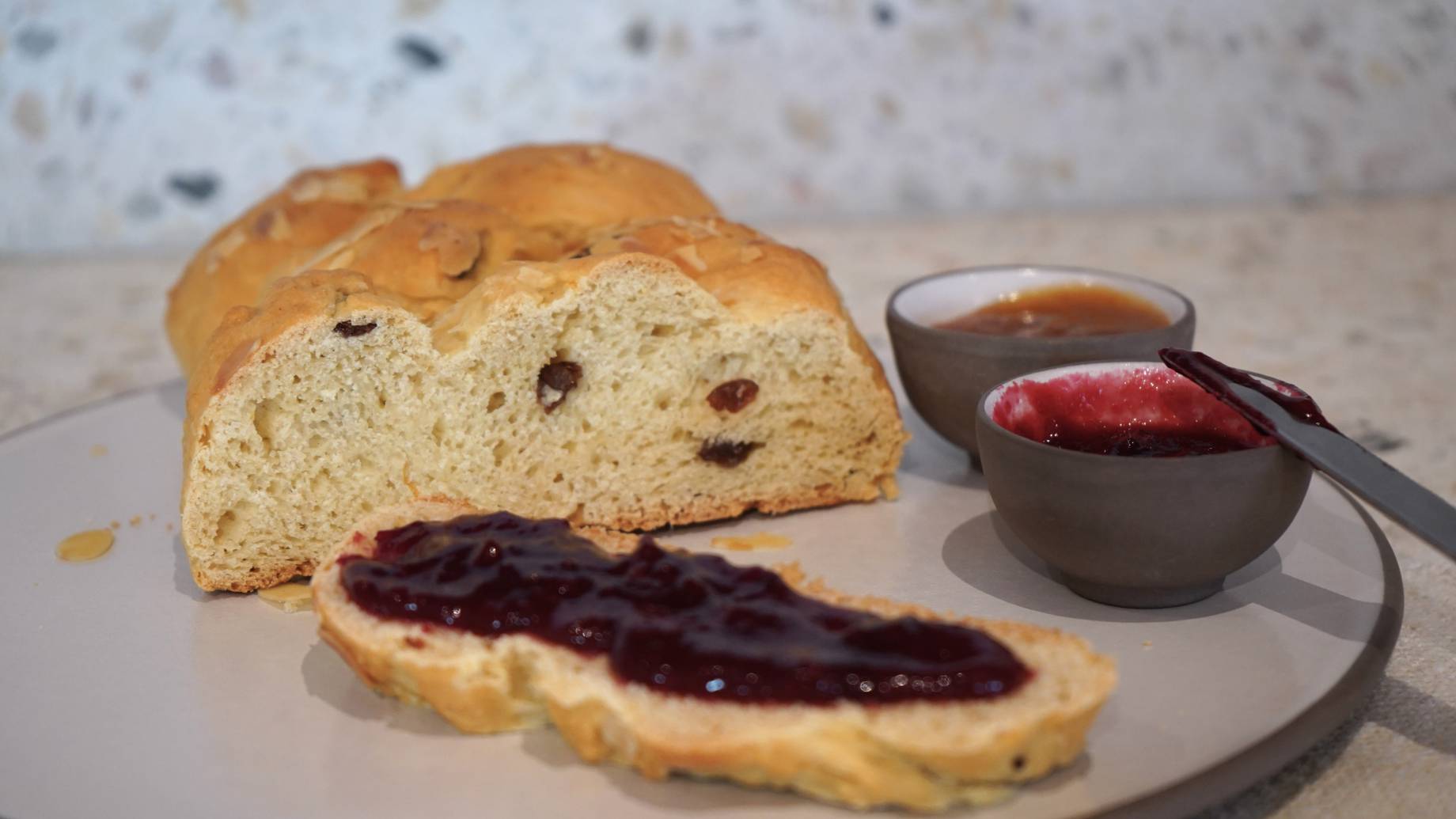 - Osterzopf mit ca. 2 EL Pflanzendrink einstreichen, gehobelte Mandeln darüberstreuen.