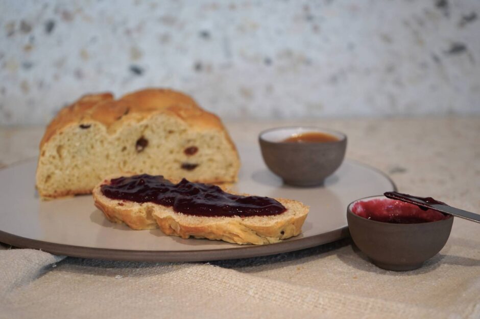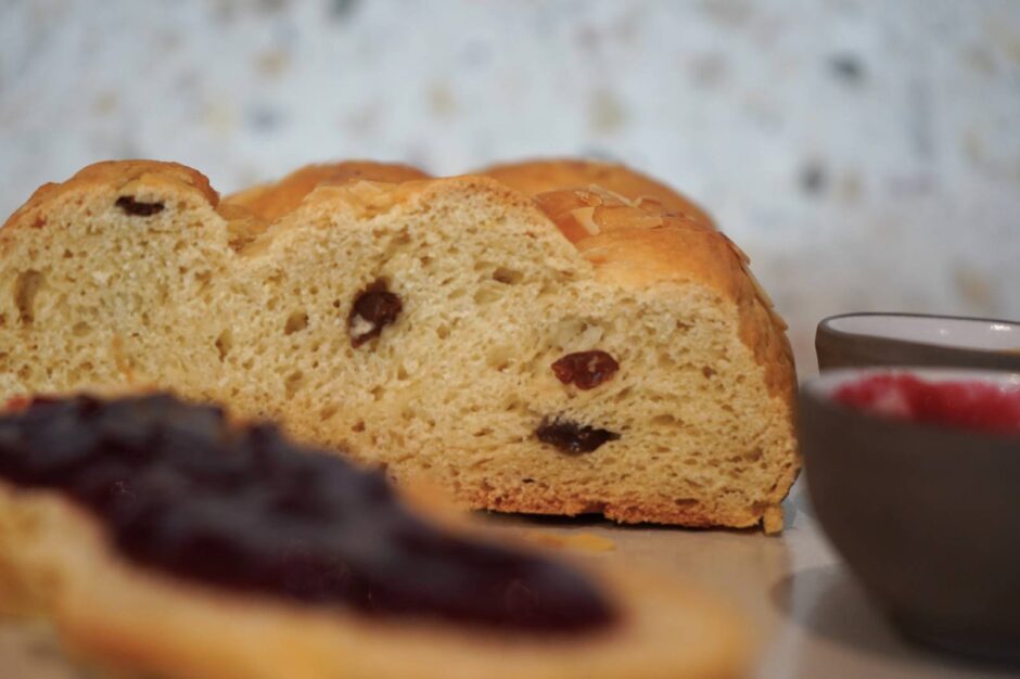 - Teig in drei Portionen teilen und diese zu langen Rollen formen, anschließend zu einem Zopf flechten und auf einem mit Backpapier ausgelegten Backblech bei Zimmertemperatur nochmals 30 Minuten gehen lassen.