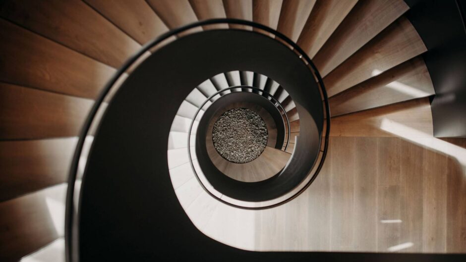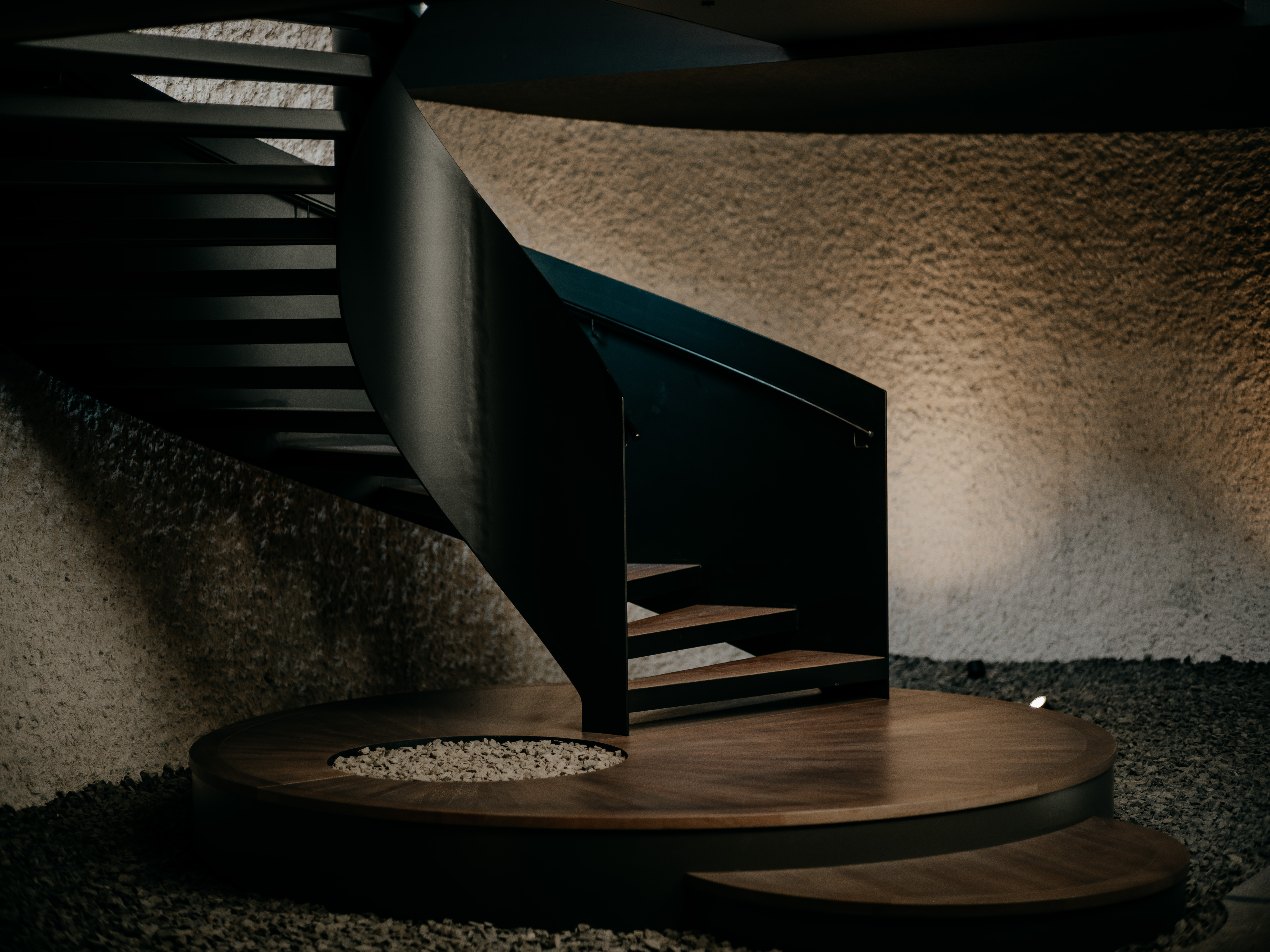 Die Treppe versteht sich als Raumskulptur, wie ein Möbelstück im Raum, das Präsenz zeigt, insbesondere durch das Antrittspodest im unteren Bereich. Unten herrscht Dunkelheit, und genau hier beginnt eine bewusst gestaltete Wegführung. Diese untere Zone fungiert als Zwischenraum – eine Übergangszone, die Zeit zum Ankommen, zum Erden und zur inneren Vorbereitung bietet. Es ist ein Ort der Ruhe, eine Phase der „Seelenzeit“, bevor man weitergeht. Von hier aus führt der Weg Schritt für Schritt nach oben ins Licht.