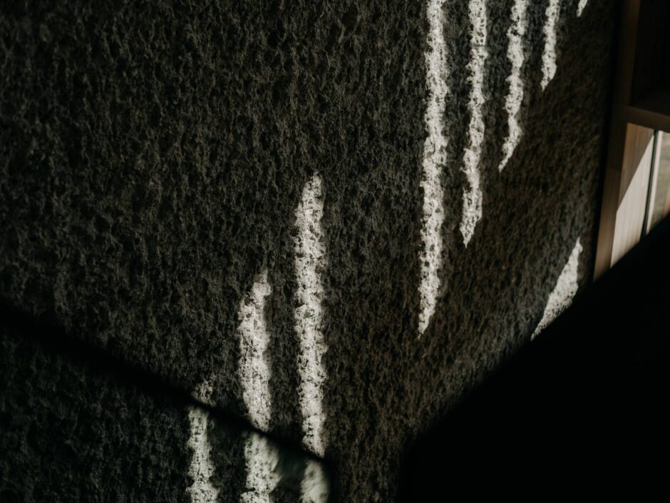 Der gespitzte Beton beziehungsweise Stein symbolisiert die Schwere, das Schützende und Behütende des Untergrundes und der Natur. Aus dieser massiven, erdverbundenen Atmosphäre heraus entwickelt sich der Weg in Richtung Leichtigkeit – hin zum Licht und zur Holzbauweise des oberen Bereichs. Die Materialität unterstützt diesen Übergang bewusst und emotional.