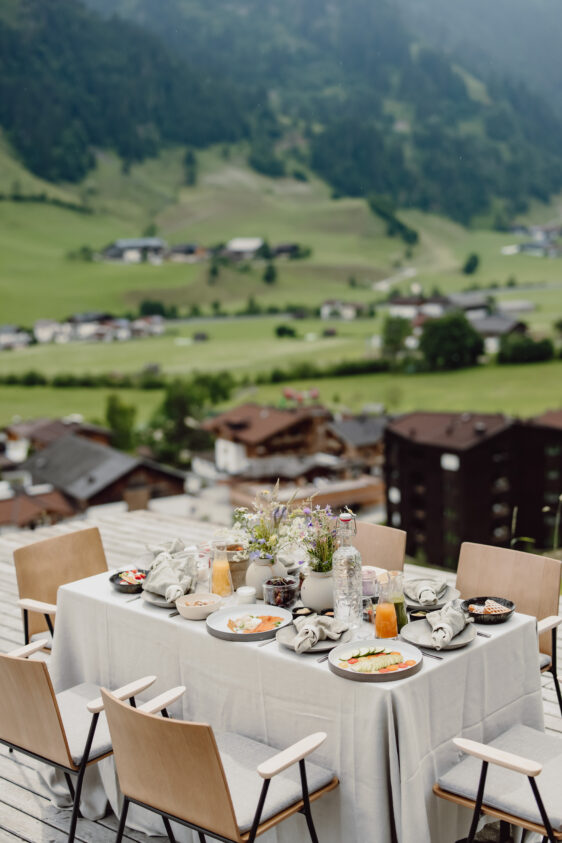 Frühstück auf der Panorama-Plattform oberhalb des Hotels mit traumhaftem Weitblick über das Resort. Bei Schönwetter in den Sommermonaten buchbar.