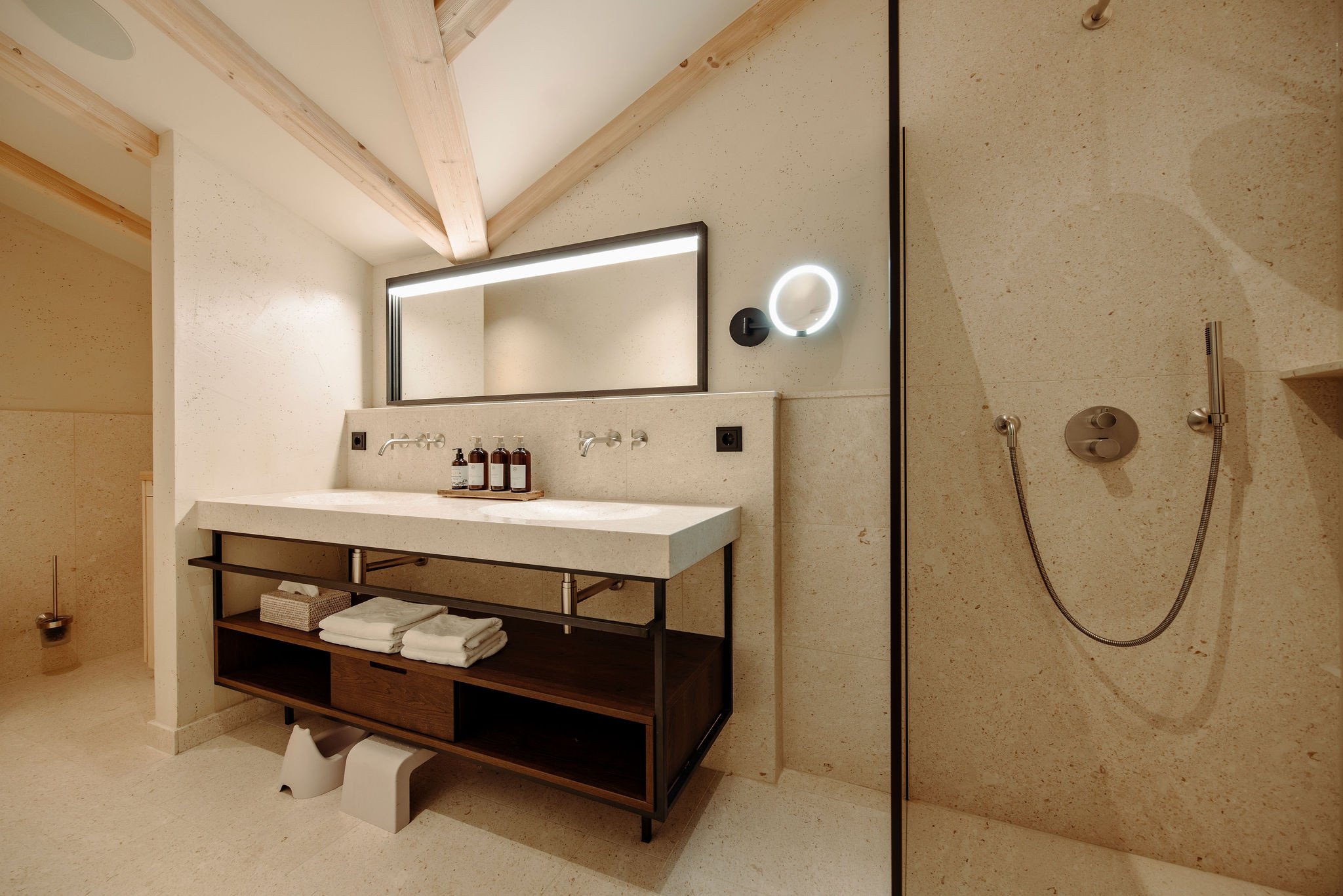- Badezimmer mit Doppelwaschbecken und Dusche