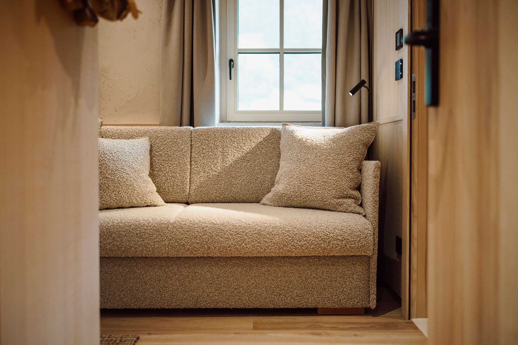- Edles Design mit hochwertigen heimischen Materialien wie Weißtanne und Leinen, Wohn- & Schlafraum mit Doppelbett aus Zirbenholz sowie hochwertigem Schlafsofa, Balkon mit Blick in die Berge