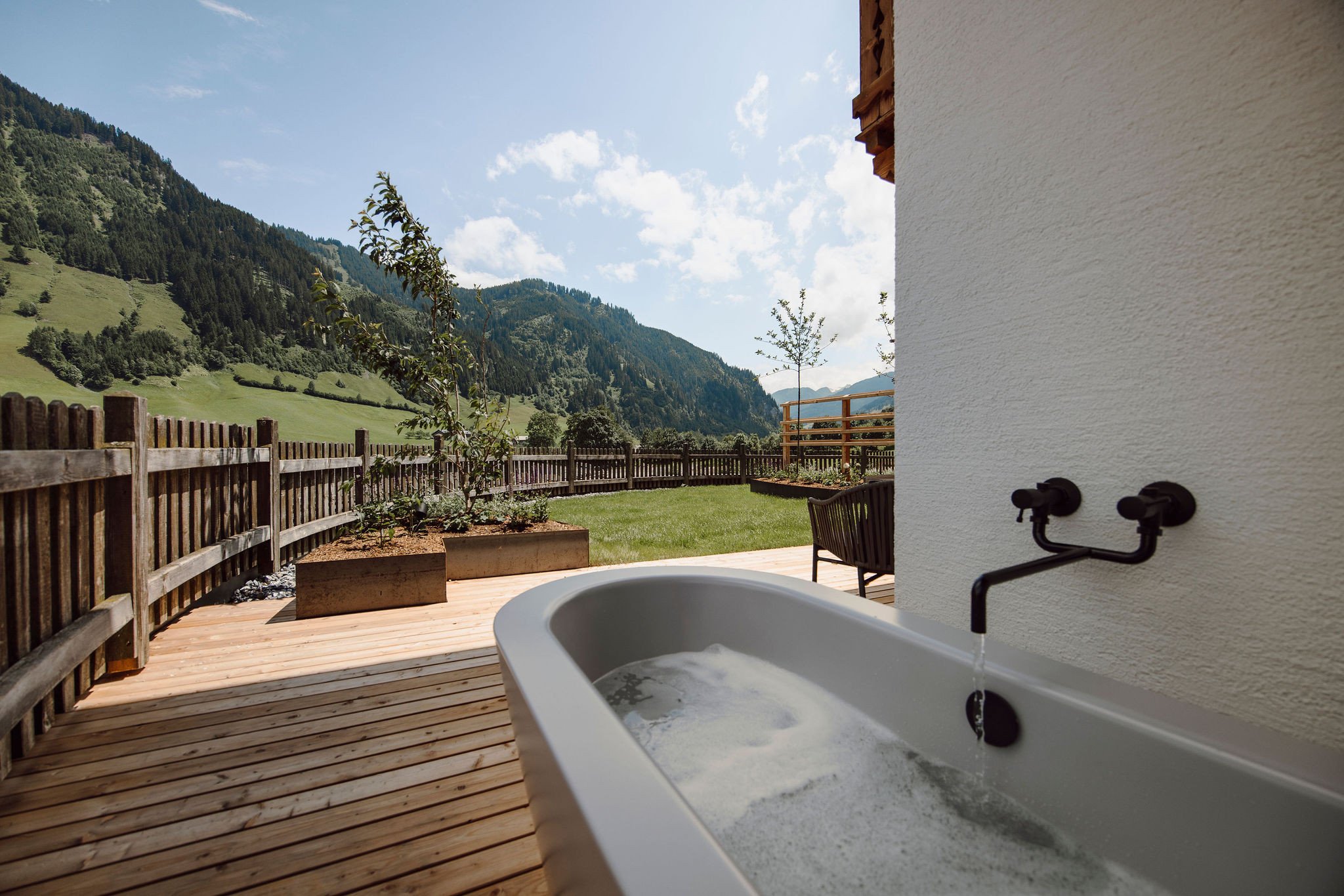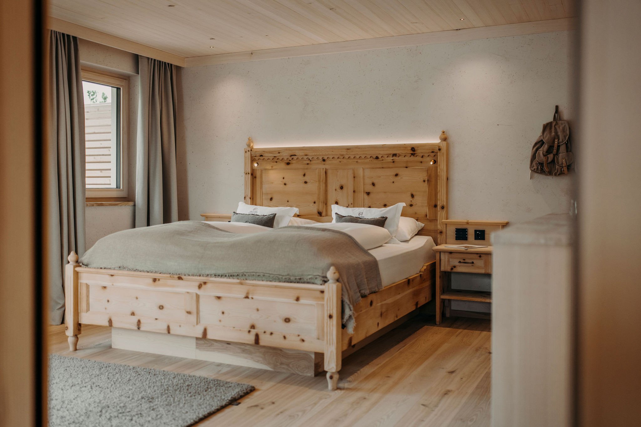 - Edles Design mit hochwertigen heimischen Materialien wie Weißtanne und Leinen, Wohn- & Schlafraum mit gemütlicher Sitzgelegenheit, Doppelbett aus Zirbenholz, Separates Kinderzimmer mit Klapp-Stockbett, Eigener Garten mit Außenbadewanne