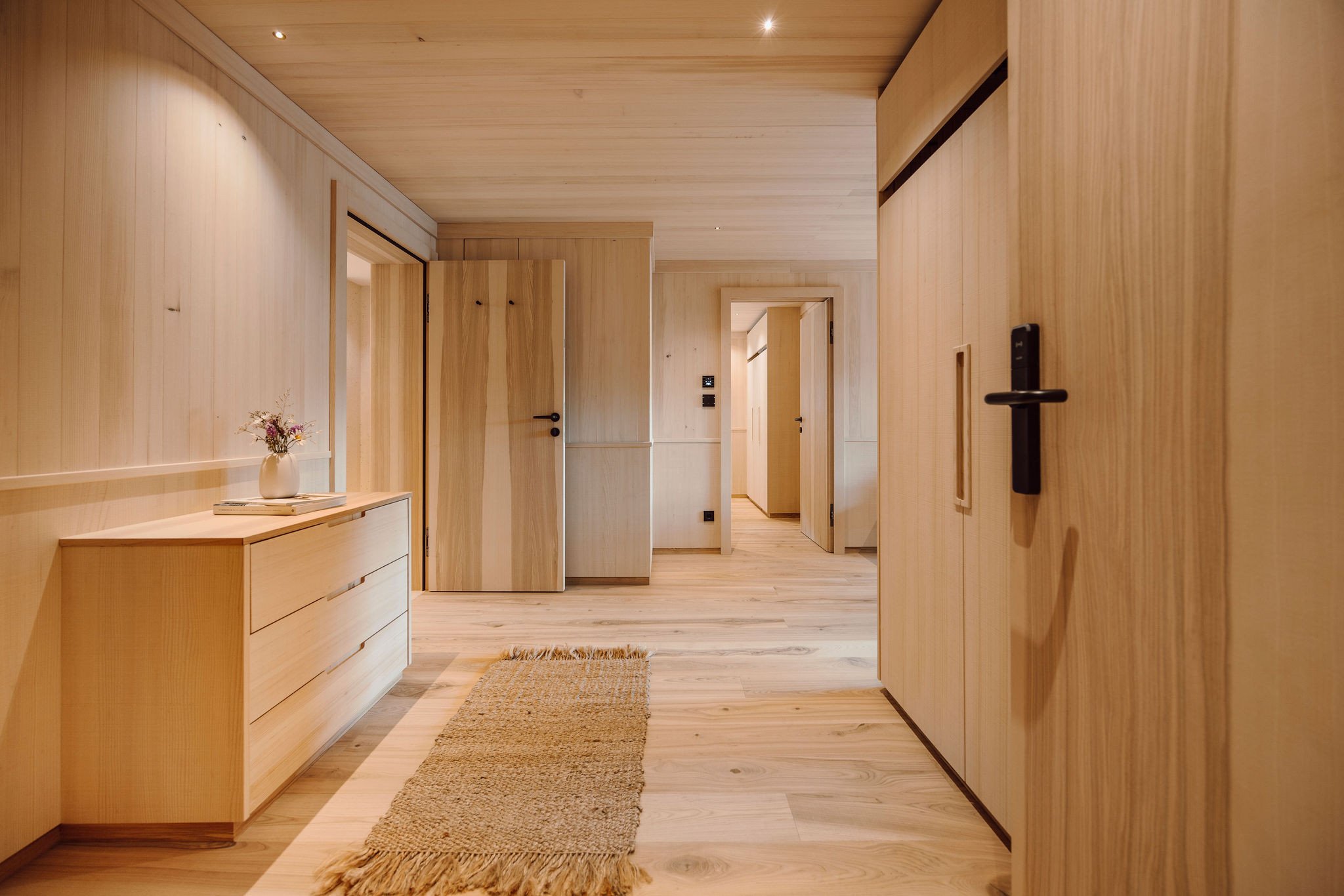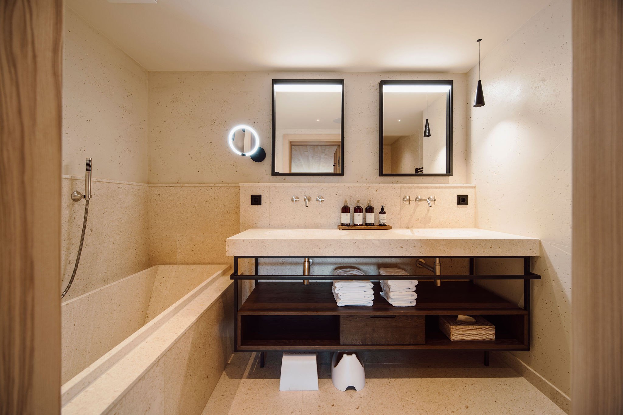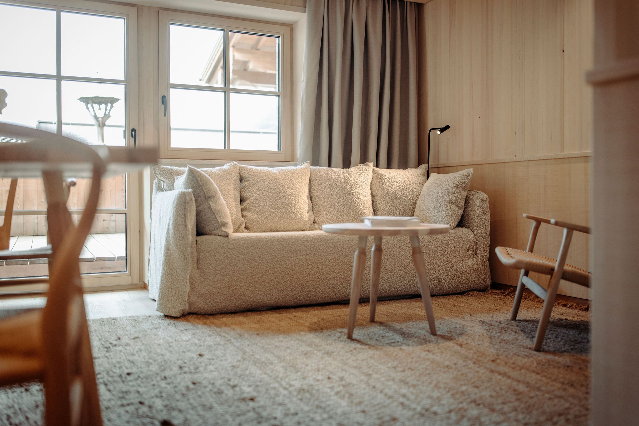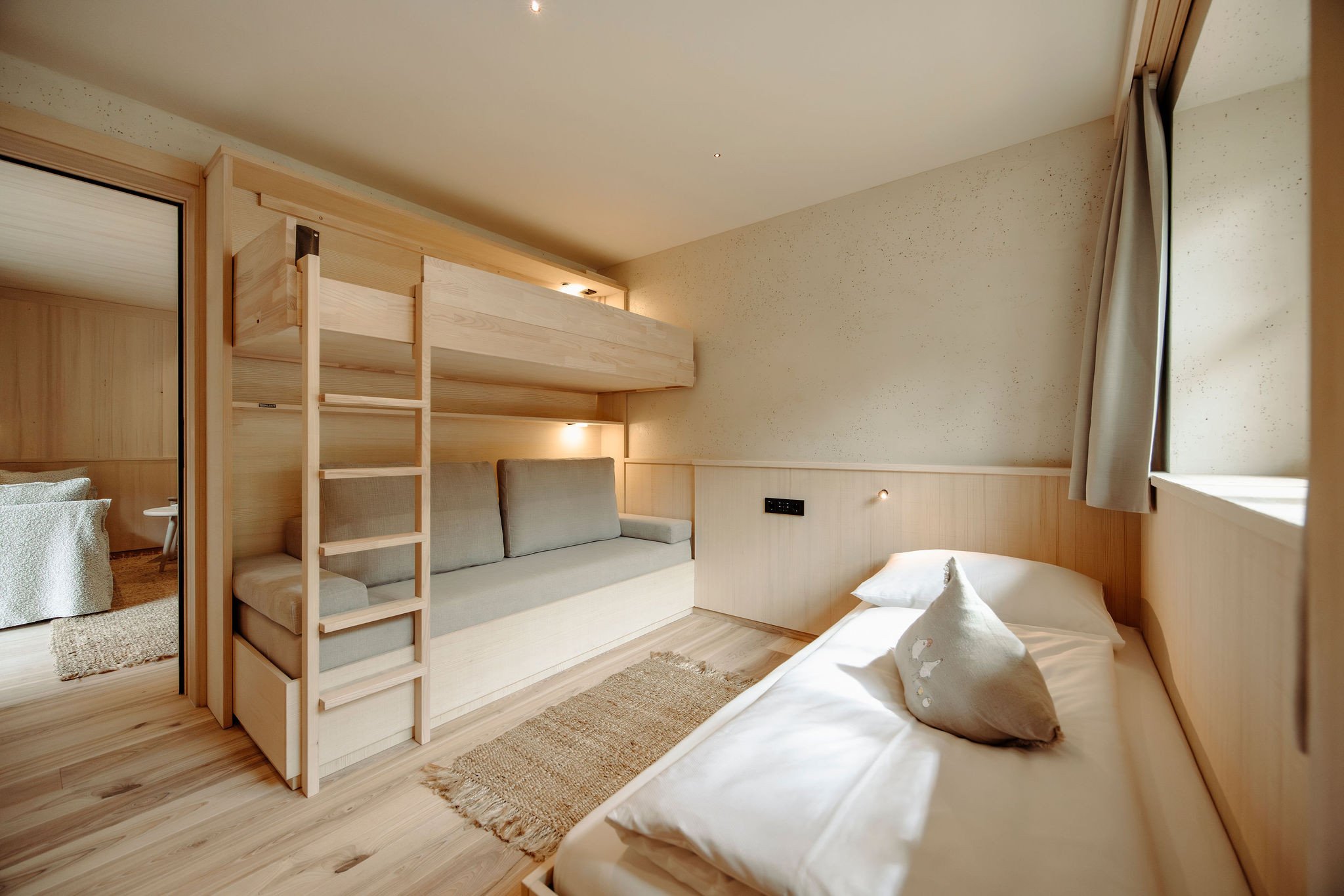 - Separates WC, Badezimmer aus Naturstein mit Doppelwaschbecken, Badewanne sowie Dusche, Terrasse mit Bergblick, Balkon mit Blick in die Berge, Separates Kinderzimmer mit Einzel- sowie Klapp-Stockbett, Schlafzimmer mit Doppelbett aus Zirbenholz, Wohnraum mit Sitzgelegenheit und Sofa, Edles Design mit hochwertigen heimischen Materialien wie Weißtanne und Leinen