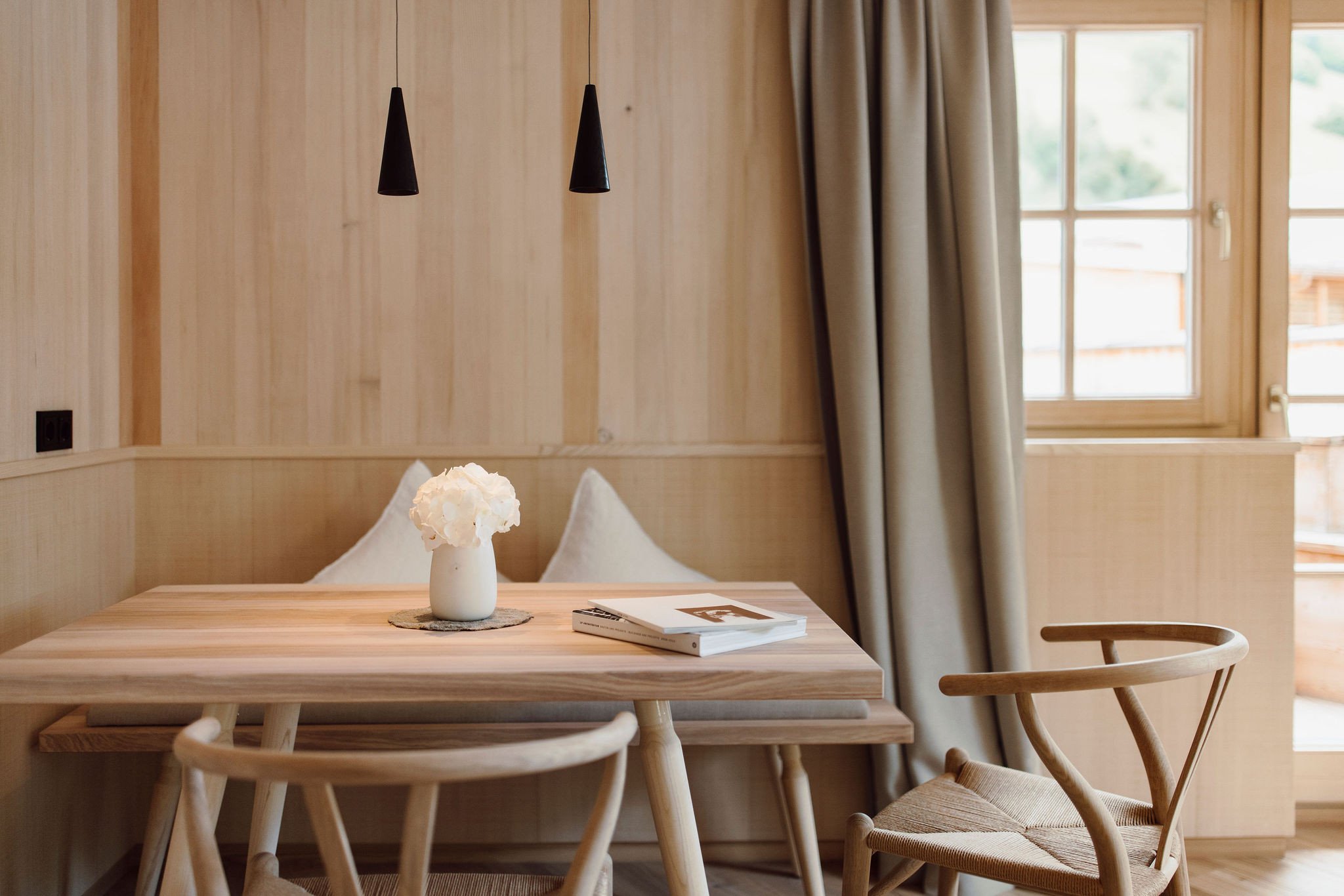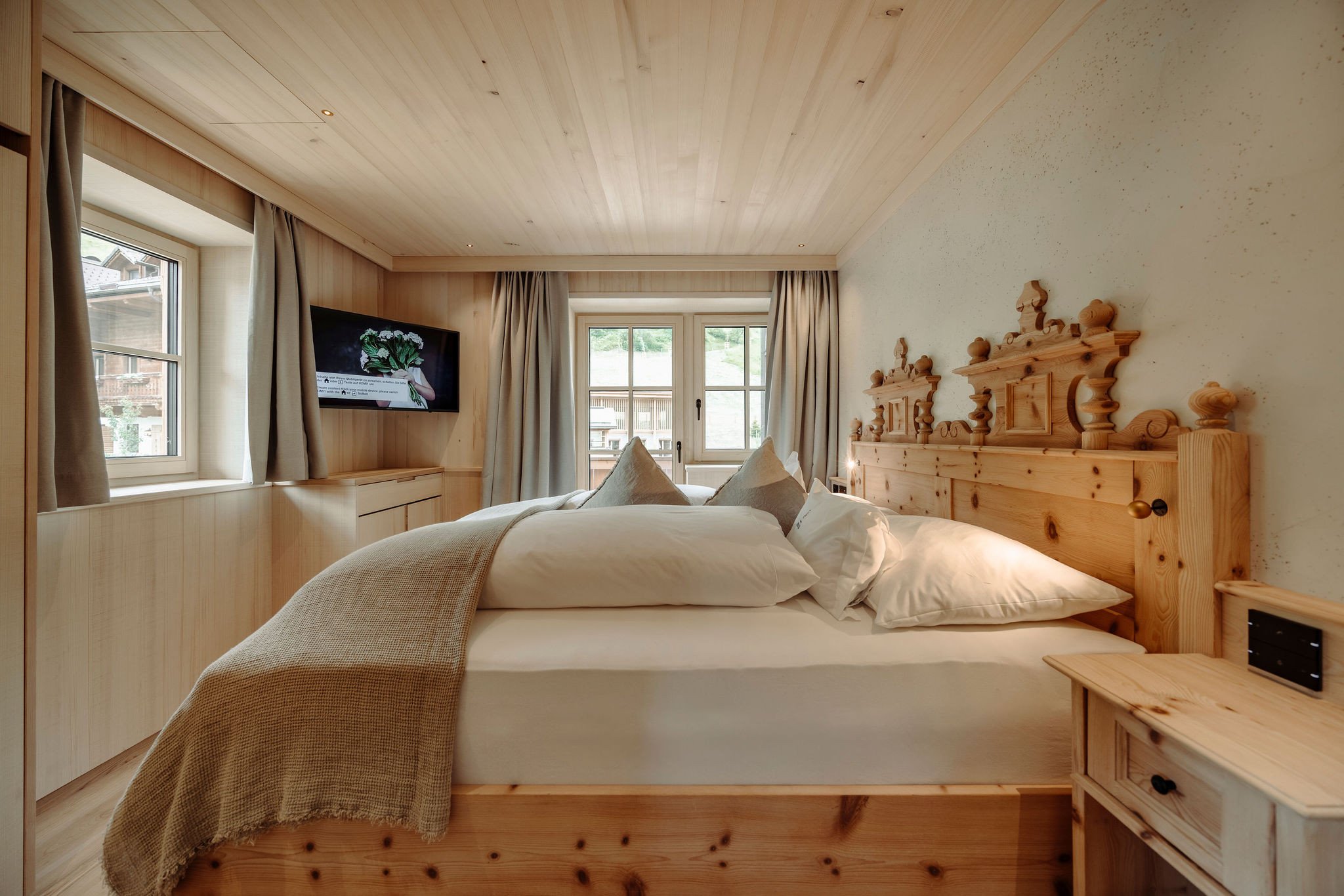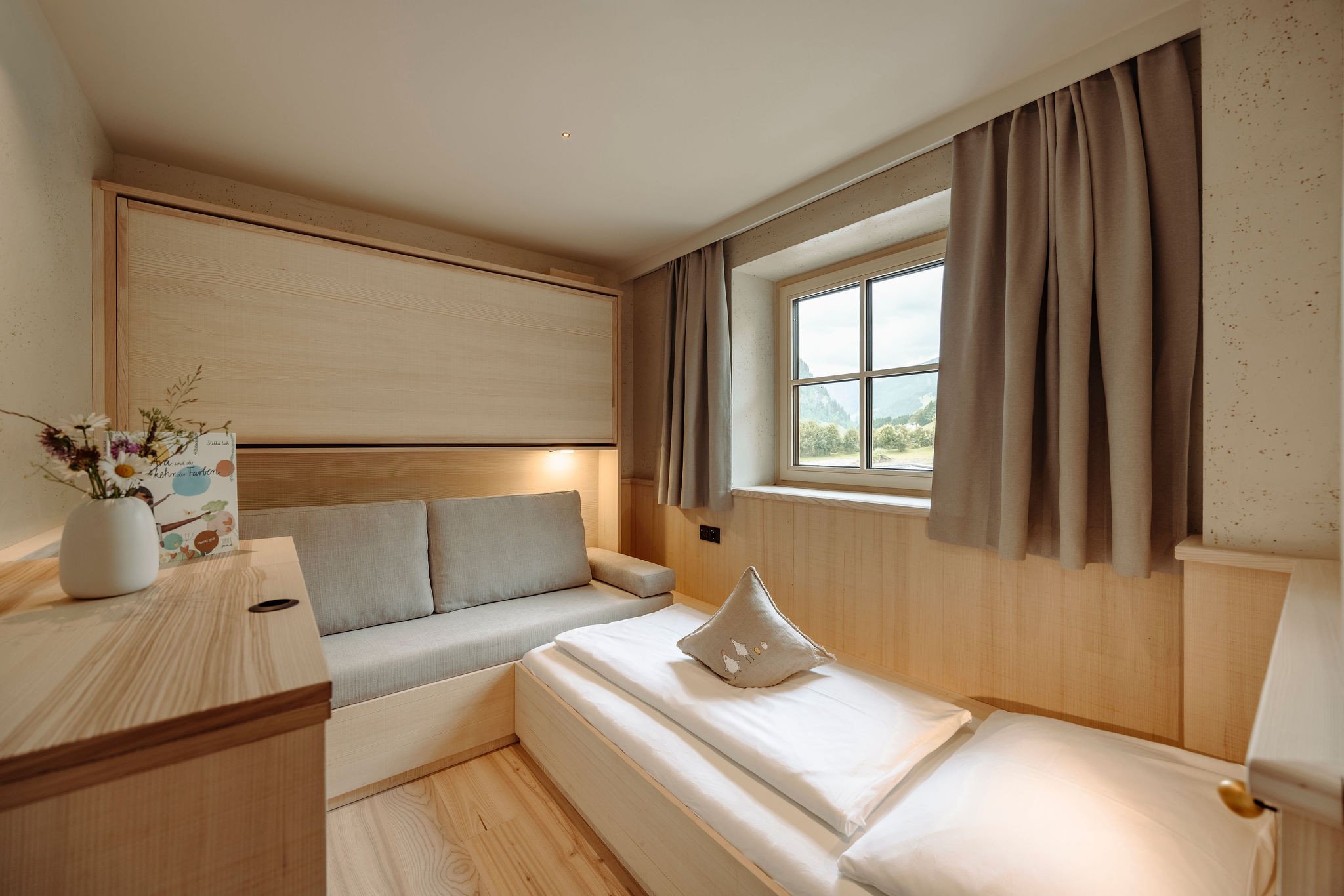 - Balkon mit Blick in die Berge, Separates WC, Badezimmer aus Naturstein mit Doppelwaschbecken, Badewanne sowie Dusche, Separates Kinderzimmer mit Einzel- sowie Klapp-Stockbett, Schlafzimmer mit Doppelbett aus Zirbenholz, Gemütlicher Wohnraum mit Sofa, Edles Design mit hochwertigen heimischen Materialien wie Weißtanne und Leinen