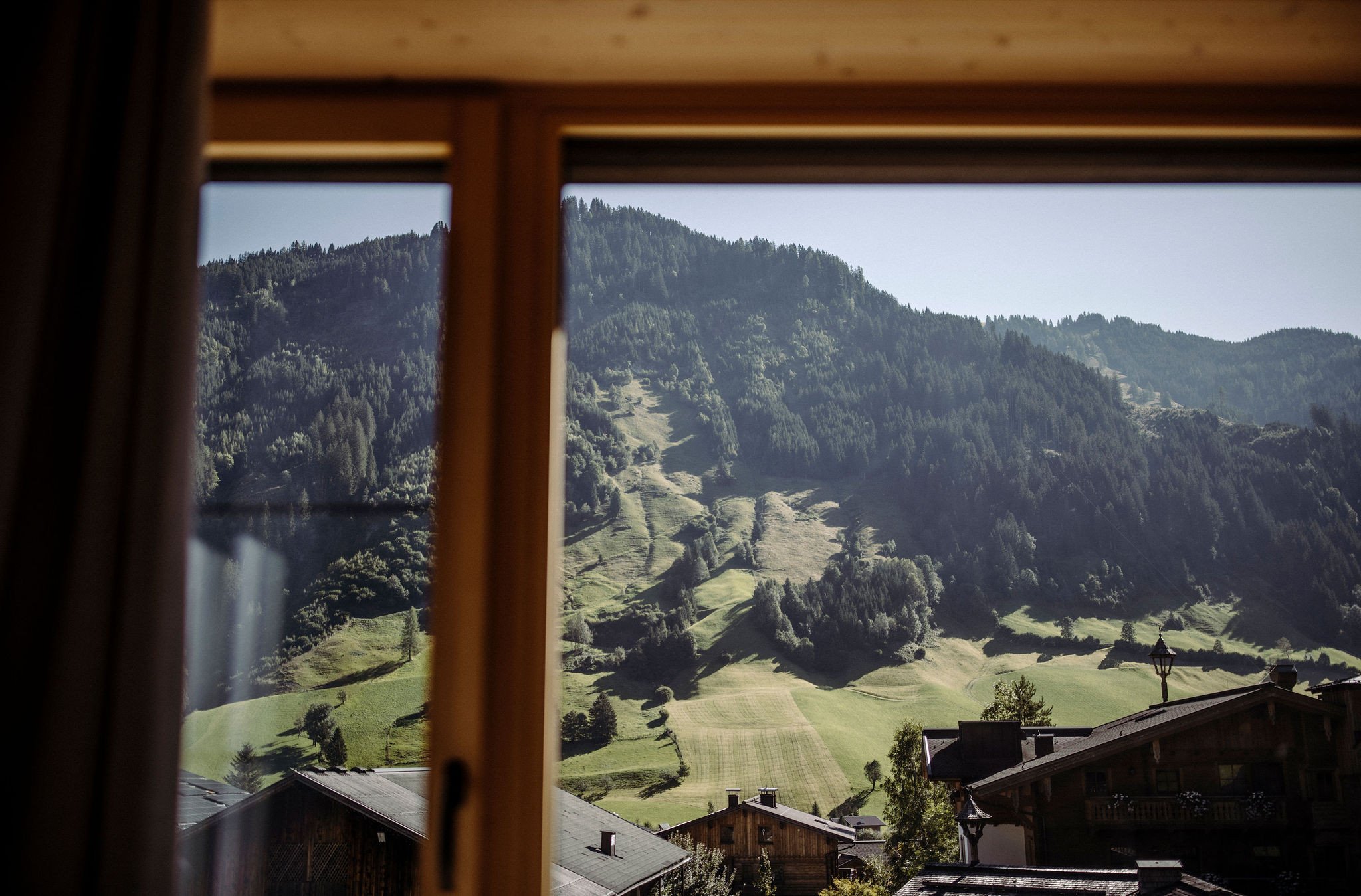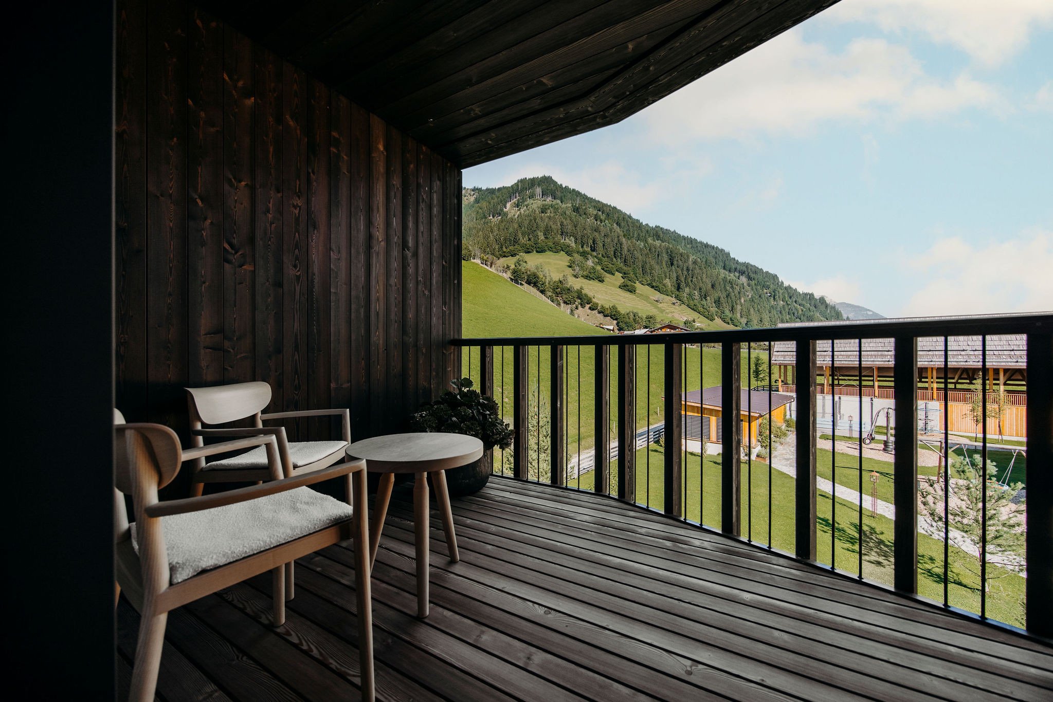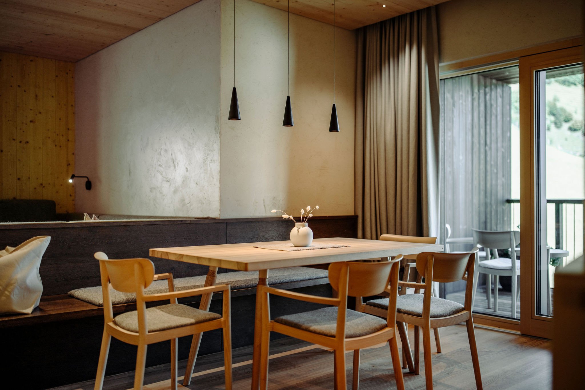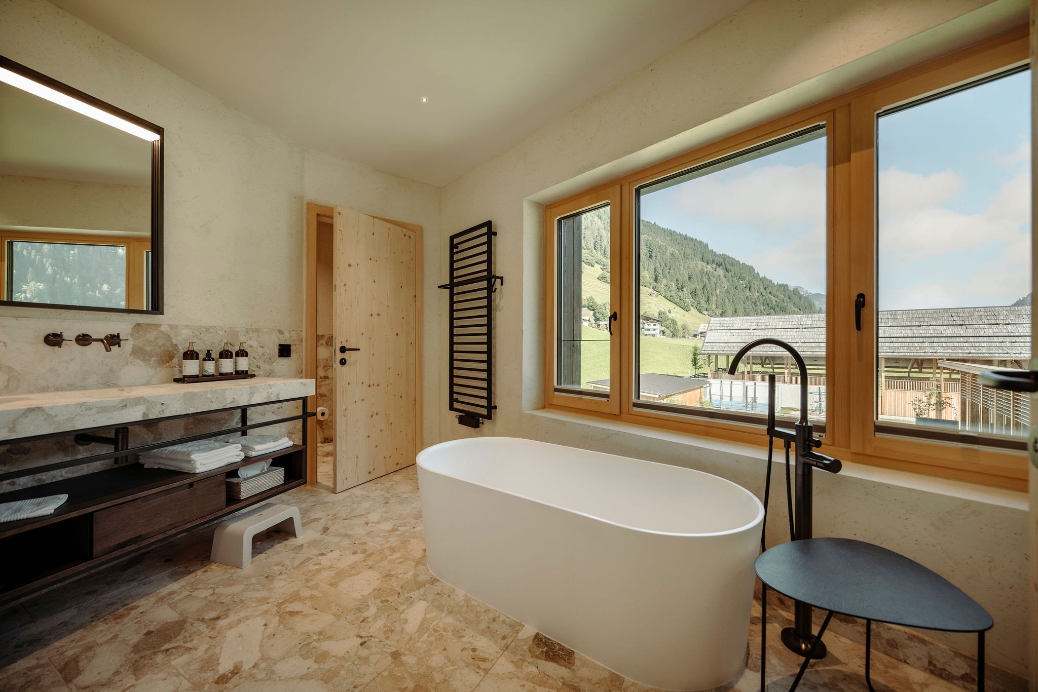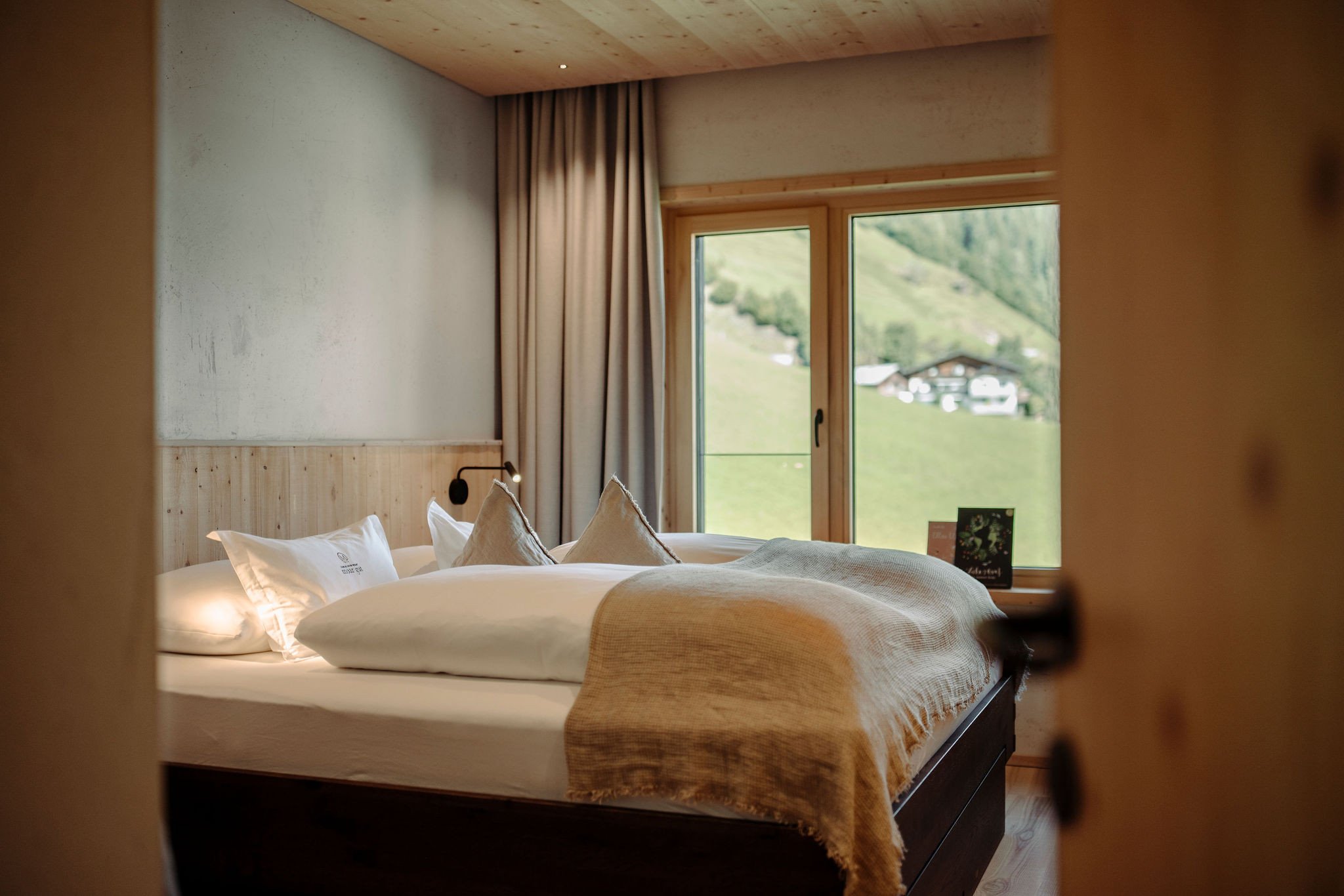 - Edles Design mit hochwertigen heimischen Materialien wie Fichte, Leinen sowie Loden, Wohnraum mit Sitzgelegenheit und Sofa, Schlafzimmer mit Doppel- und Einzelbett sowie angeschlossenen Badezimmer aus Naturstein, Doppelzimmer mit angeschlossenen Badezimmer aus Naturstein sowie freistehender Badewanne, Loggien mit Blick in die Berge, Direkter Zugang zum Aufzug
