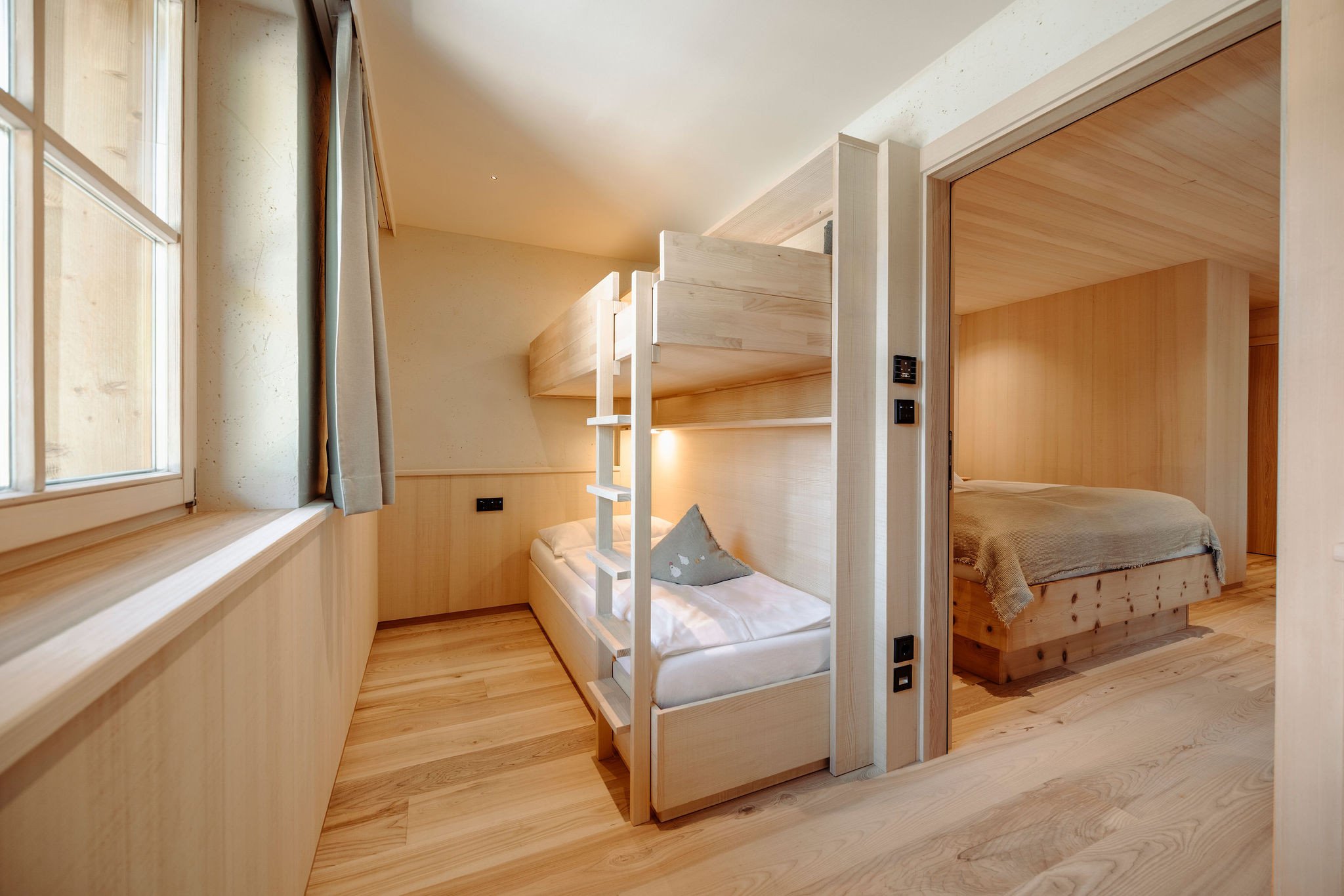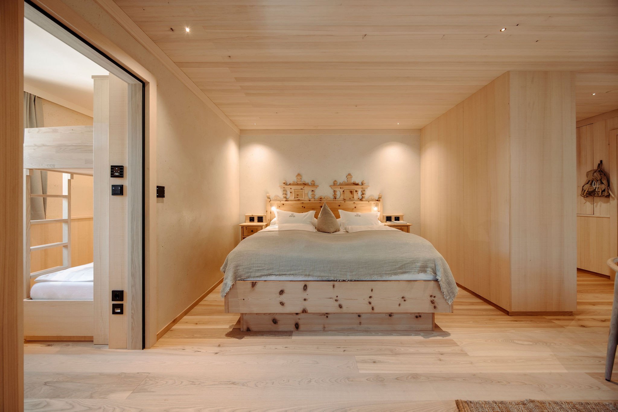 - Edles Design mit hochwertigen heimischen Materialien wie Weißtanne und Leinen, Gemütlicher Wohn- & Schlafraum mit Sitzgelegenheit, Doppelbett aus Zirbenholz, Balkon mit Blick in die Berge, Separates Kinderzimmer mit Klapp-Stockbett, Separates WC