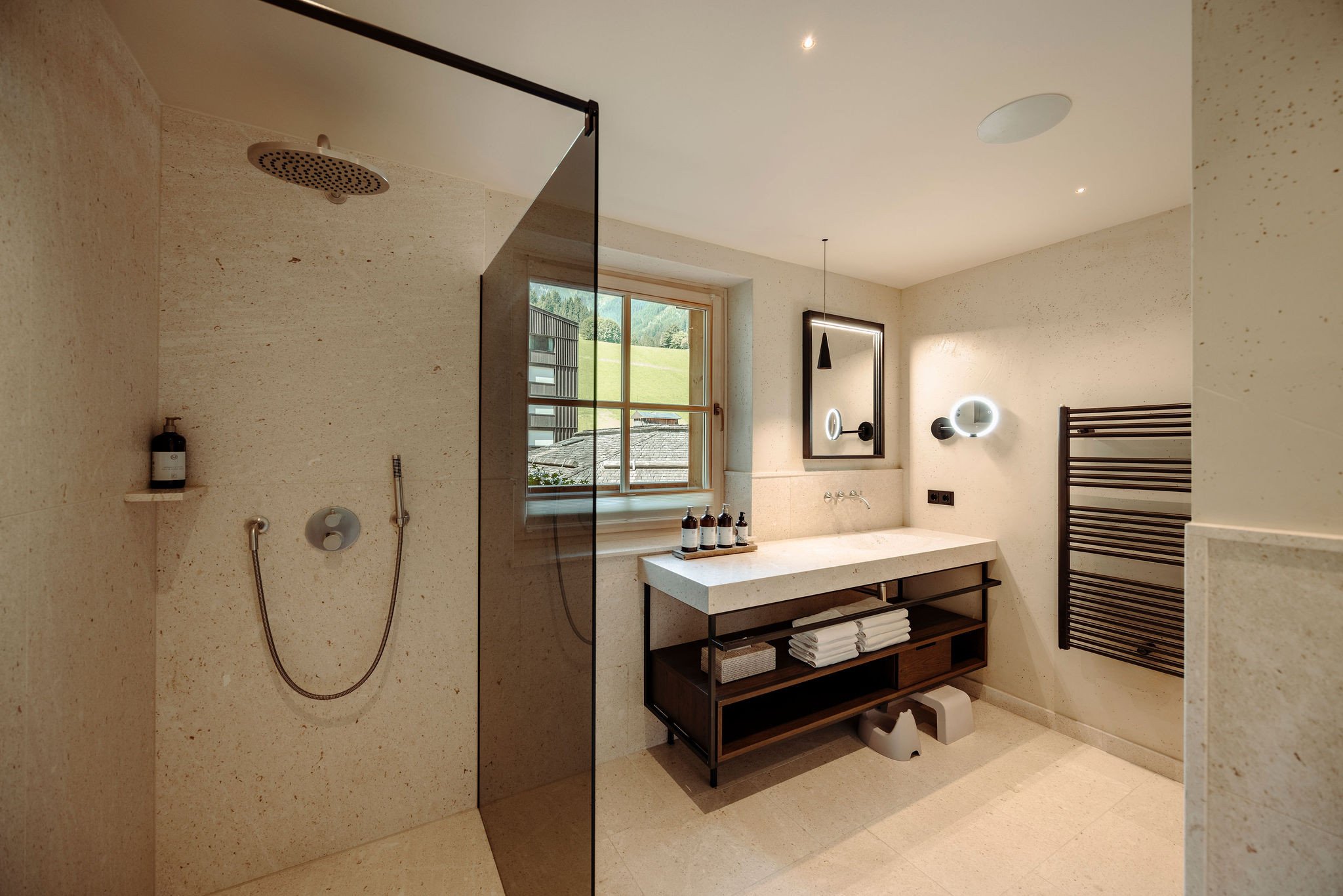 - Badezimmer aus Naturstein mit Dusche und Badewanne