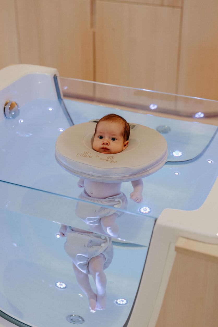 Danach geht es in die warmen Babybadewannen zum Floating. Dank dem Floatingring genießen die Kinder die Schwerelosigkeit wie in Mamas Bauch.