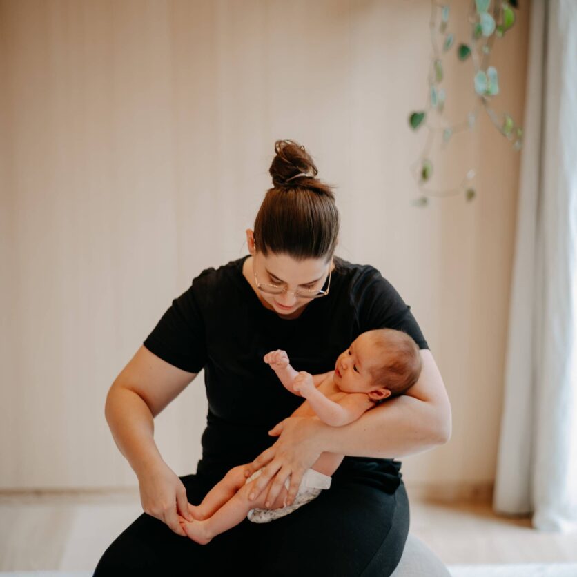 - Hebamme Laura leitet Sie zu den Baby Yoga Übungen an einer Puppe an.
